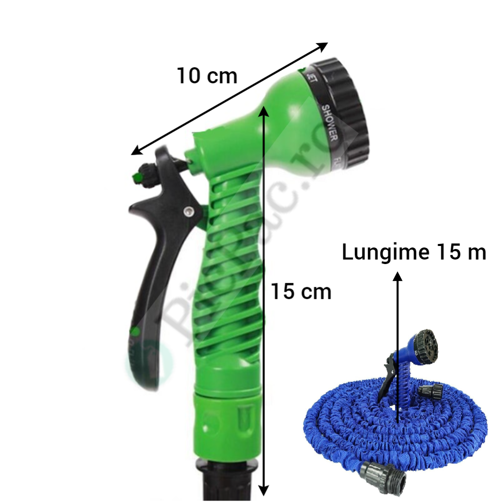 Transformă îngrijirea grădinii într-o experiență plăcută și eficientă! Furtunul extensibil de 15 metri cu pistol de stropit inclus este soluția perfectă pentru grădinarii pasionați și profesioniștii din agricultură.